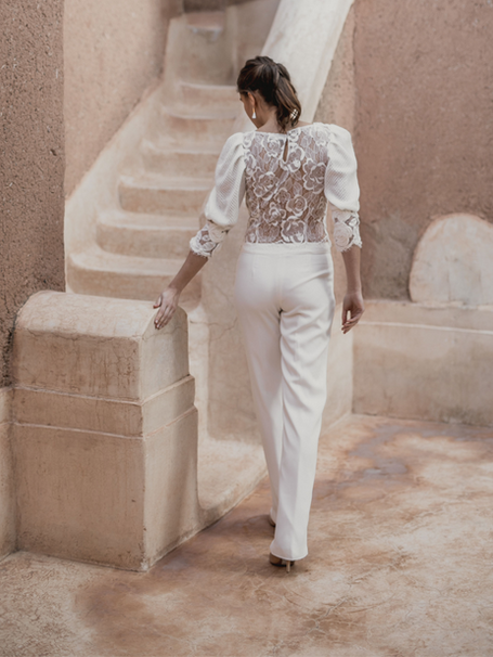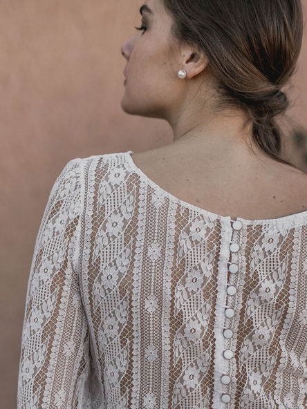 Top en dentelle française, opaque sur l’avant, avec manches 3/4. Fermeture boutonnée dans le dos soulignée d’un liseré doré.