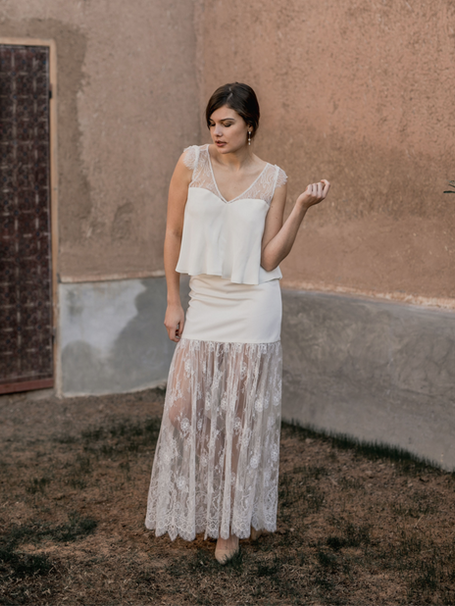 Top en dentelle française, doublé couleur chair pour un effet seconde peau. Dos nu profond et manches 3/4 en dentelle délicate. Silhouette à la fois audacieuse et raffinée.